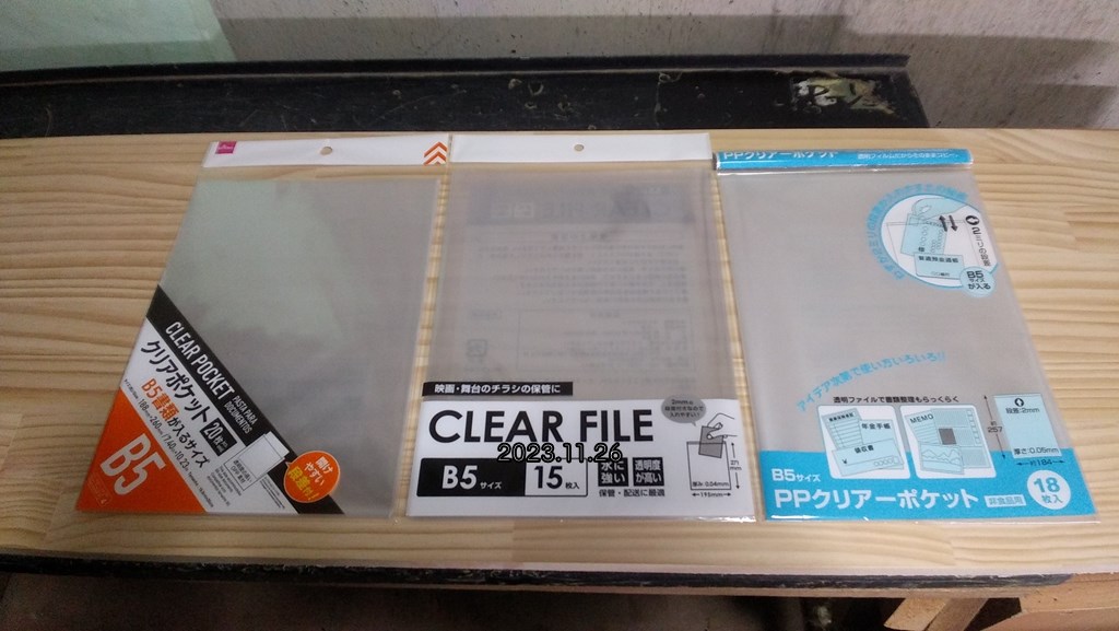 100円ショップの店舗数上位3社でありますダイソー、セリア、キャンドゥの近所の店舗の文具コーナーを廻りまして各B5サイズのクリアポケットを入手しました。