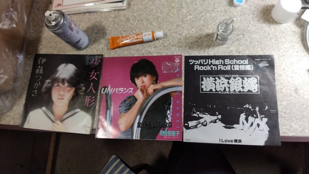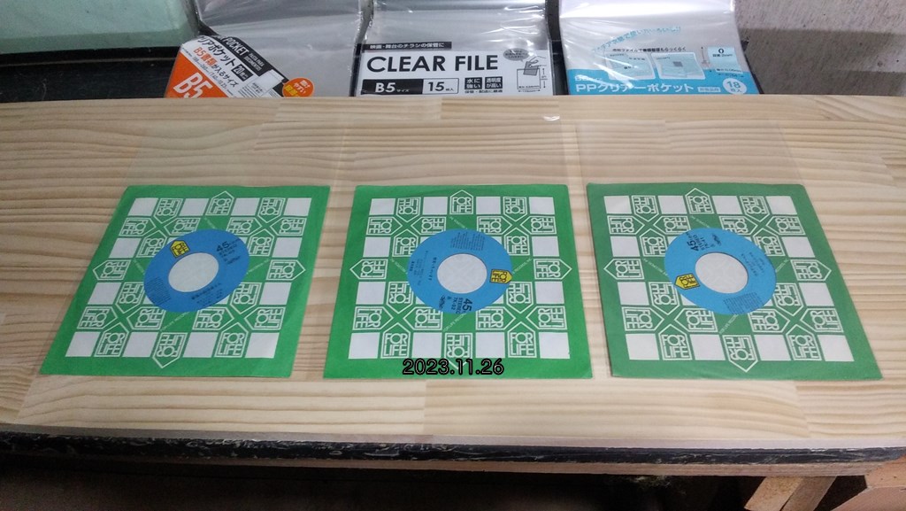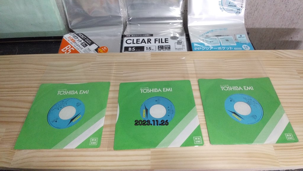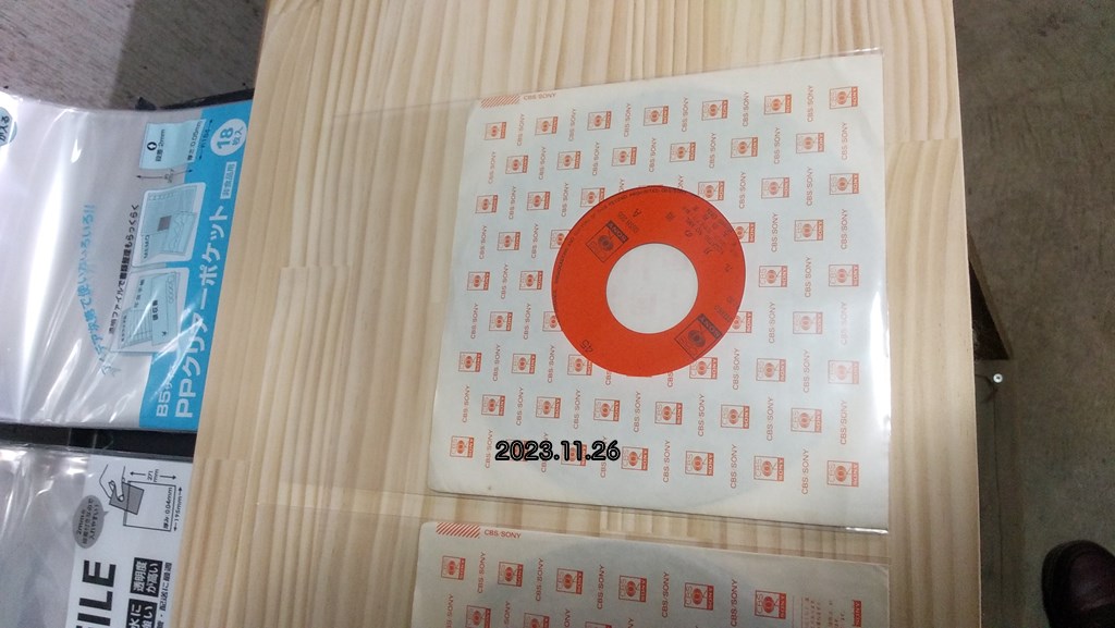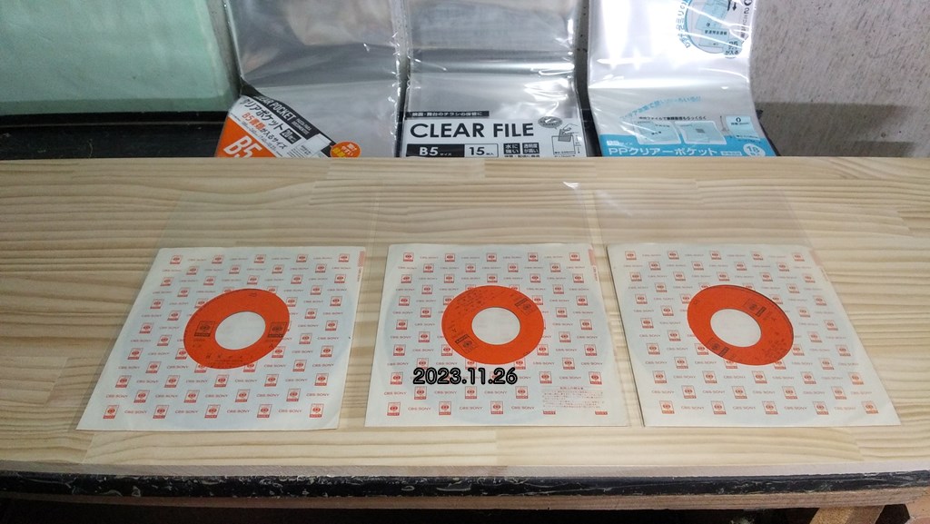 この紙ジャケット、比較しますと各社すこしずつ大きさが違うんですね。CBSソニーの紙ジャケットは181mmありました。レコードが入るので少し厚みを見ますが、いずれのクリアポケットも綺麗に収まります。