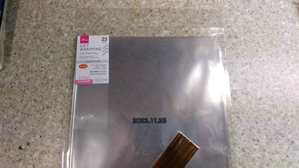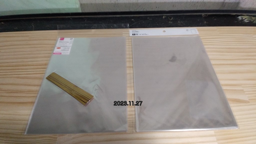 ダイソーのものは厚みを記載していませんが0.03mmかなぁという感じです。手触り感は下で触れるラッピング用のものと特に変わりません。OPPは基本的に伸びませんのでサイズが大事であります。