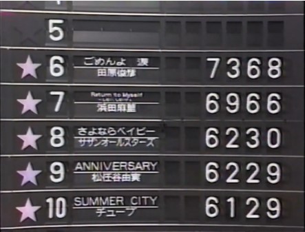 | 11 | 世界でいちばん熱い夏 | プリンセス・プリンセス | 5999点 | 1位 | -位 | -位 | -位 |